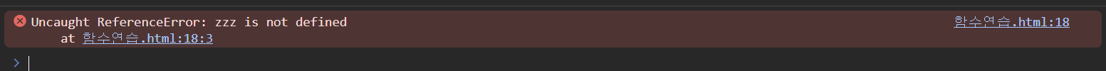 변수명 호출한걸 함수명으로 바꿔보면 zzz() 함수의 이름은 정의되지 않았다는 에러메시지가 뜬다.
